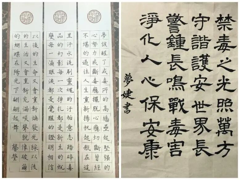 11月16日至11月22日,人文学院志愿服务部开展禁毒防艾主题优秀作品征集活动。隽永秀丽的书法,饱含深意的绘画……人文学子以文艺形式表达坚定的禁毒防艾决心。