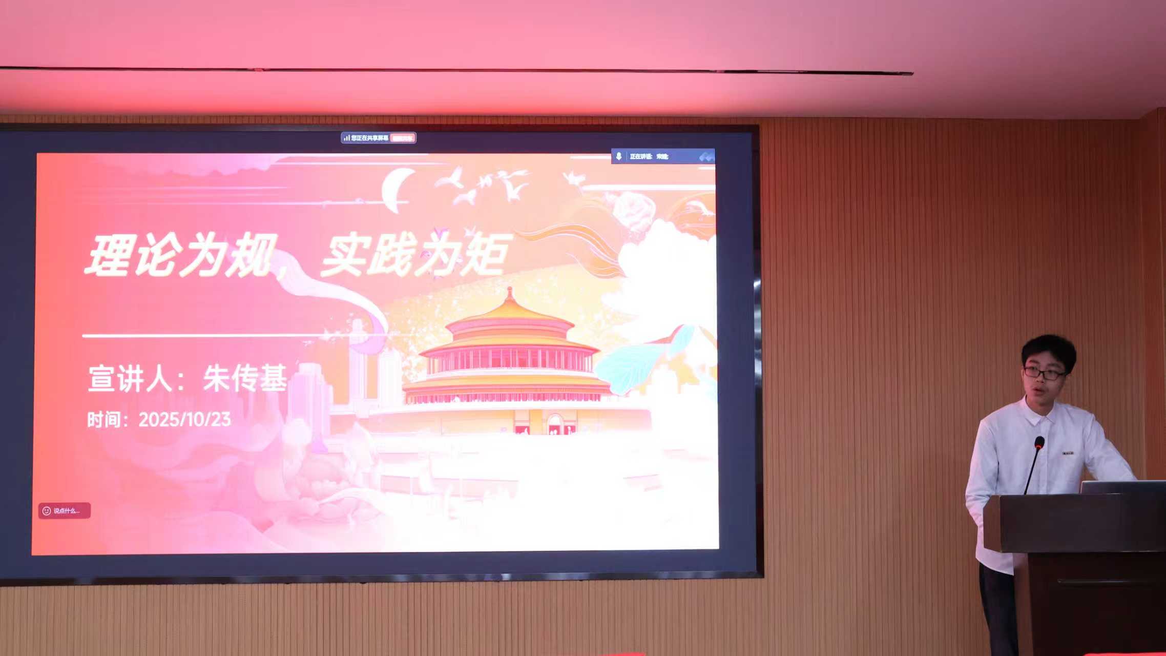为加强党的创新理论在青年中的阐释与传播,引导团员青年学生骨干深入学习贯彻习近平新时代中国特色社会主义思想,物信学院于2025年10月23日晚在物信南楼思源厅举办青马学员理论宣讲会,特邀三位校“青马工程”培训班的学生骨干进行分享。2024级班团以线下集中的形式到场聆听,2025级新生团员则通过线上腾讯会议参与学习。
