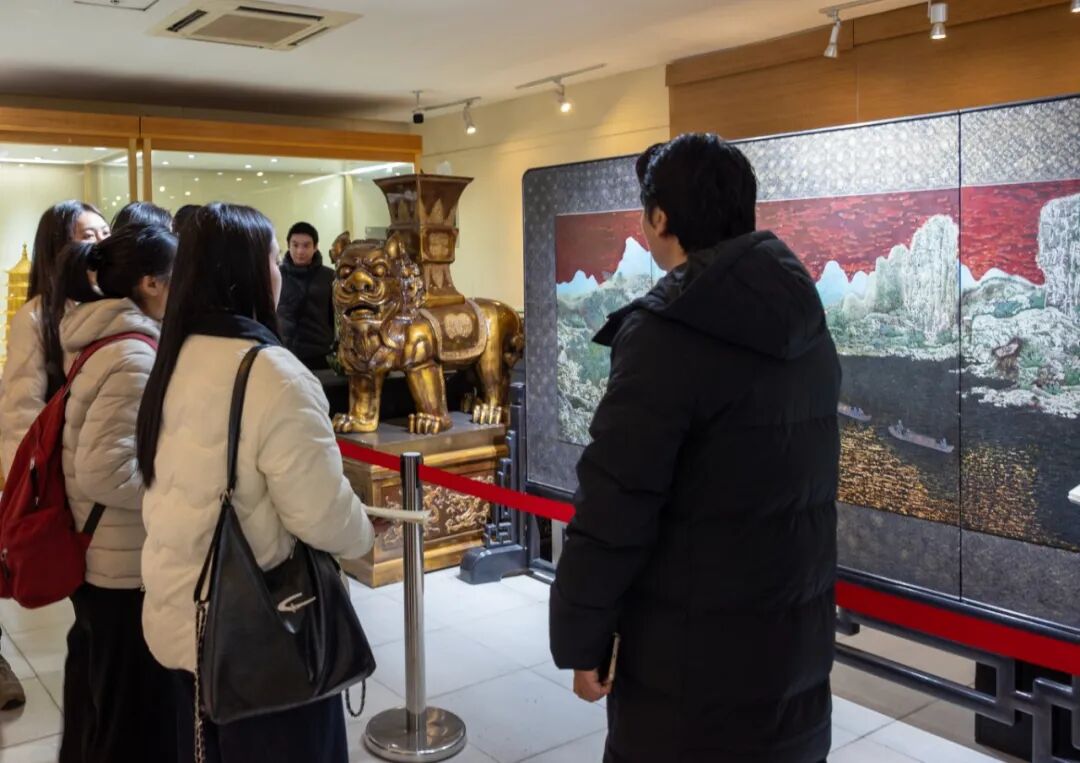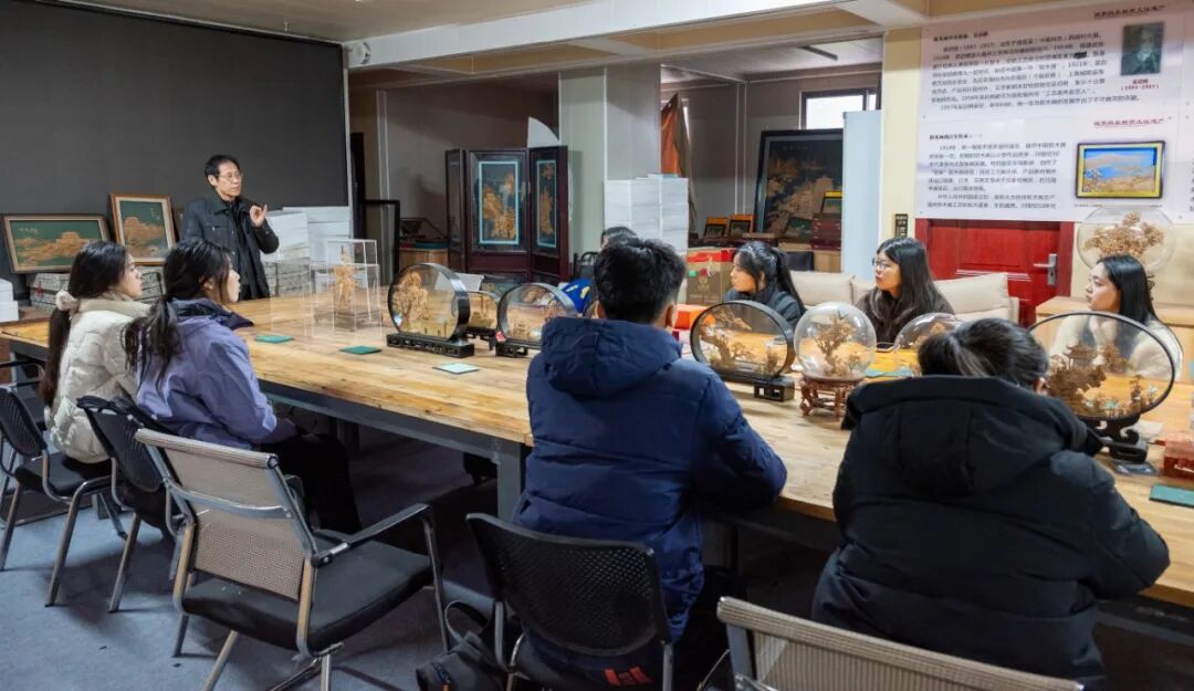 在上下杭古厝的福州市非物质文化遗产展示馆,实践队队员们在古厝雅韵与非遗风华的交融中感受闽都文化的多元魅力。"福乐"展厅里,闽剧的流派演进、传统舞蹈的民俗根脉,通过影像史料与实物陈列深度呈现,沉浸式感受闽地烟火里的文化盛宴;"福匠"展厅内,脱胎漆器的匠心、寿山石雕的智慧、软木画的精致,搭配传承人数十年深耕的故事,让"择一事、终一生"的精神直击人心;"福韵"展厅中,畲族凤凰装刺绣、银饰锻造工艺,结合全息投影、幻影成像技术,生动还原畲族节庆盛景与婚嫁习俗,科技与传统的交融,让队员们直呼"仿佛置身其中",也为队员们探索非遗数字化保护传承模式提供了重要参考。