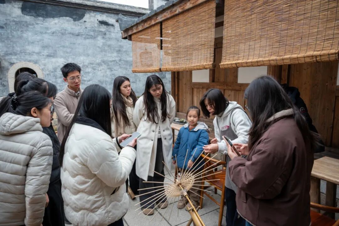实践队赴梁厝古村油纸伞体验基地,队员们分组体验选伞面、绕线、糊伞面、包边等核心工序,穿线需精准对齐伞骨孔隙,糊纸要抚平每一处褶皱,包边得力道均匀,刷油更要薄厚一致,指尖的笨拙与反复尝试,让队员们真切体会到非遗技艺传承的不易,也清晰把握到年轻群体参与非遗体验的痛点与切入点,为后续探索非遗年轻化传承模式积累了实践经验。